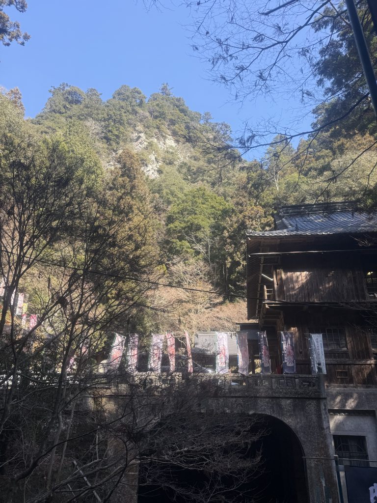 御堂は深い谷の上にまたがって立つ舞台造。寺の周囲は険しい崖が、どことなく岩屋寺さんを思い起こさせます。そういえば、岩屋寺さんも神通力を持つ法華仙人さんが住まわれていたはず・・