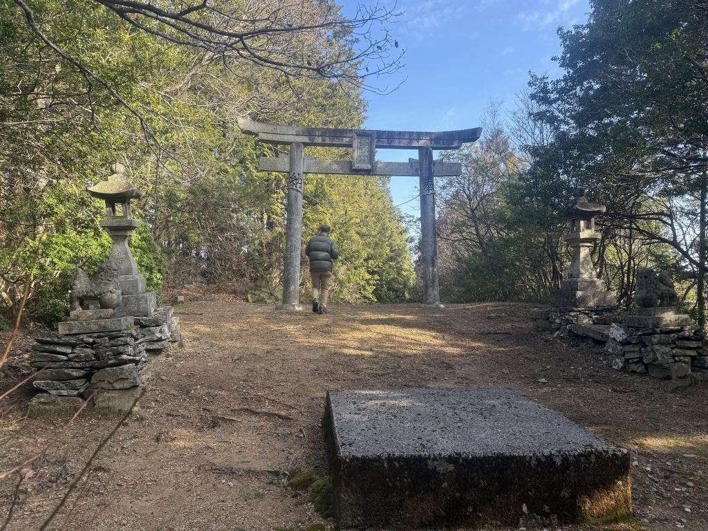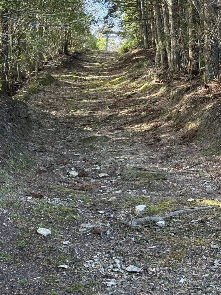 登り終えると、鳥居があり広場的な場所があったが、その先にもずっと参道が続いていて、地元の方に聞くとこの道は塩塚高原に続いているそうだ。