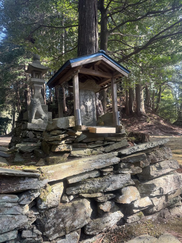 神社入り口近くに、このような小さな祠がある。よぉぉぉく見ると、祠の中に修験道者かと思われる方が彫られた石柱がお祀りされていた。私1人で来ていたら、絶対に見過ごすようなこの祠の中の修験道者についてまた話が盛り上がる。ご案内いただく地元の方も参加している調査メンバーも、全員古代史や自然科学などの分野に秀でていて、それぞれの考察が深く楽しい。